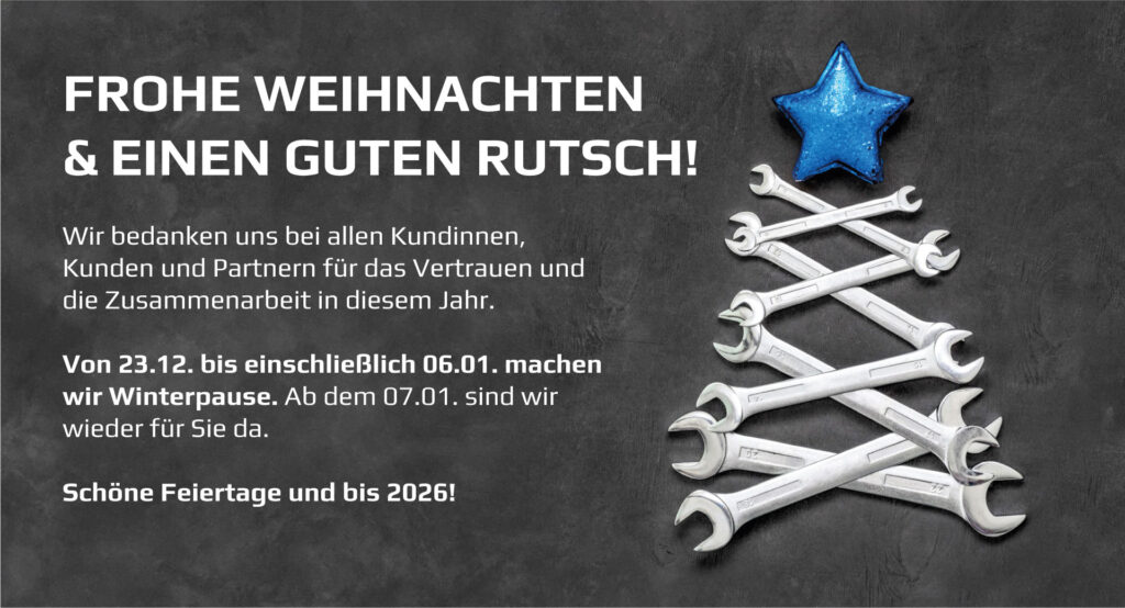 Von 23.12. bis einschließlich 06.01. machen wir Winterpause. Ab dem 07.01. sind wir wieder für Sie da.